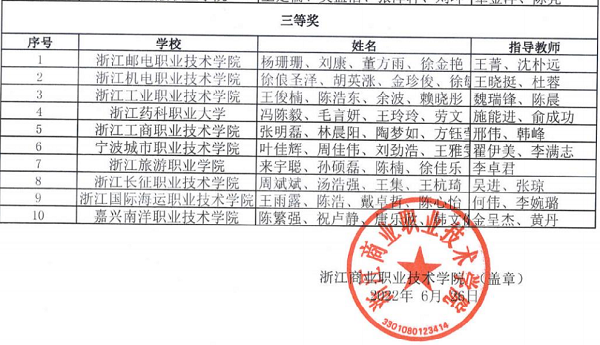 6月25日,由浙江省教育厅主办、浙江商业职业技术学院承办的2022年浙江省职业院校技能大赛高职组“市场营销技能”赛项圆满落幕。来自全省各高等职业院校(专科)的35支队伍参赛。我校商务与贸易学院市场营销专业的周斌斌、汤浩强、王集和电子商务专业的王杭琦四位同学(指导教师:吴进、张琼)获得团体三等奖。