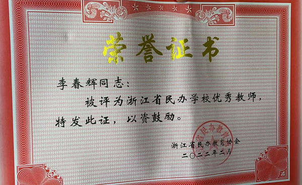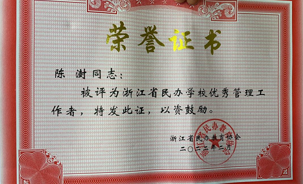 近日,浙江省民办教育协会发布了《关于表彰2021年民办学校优秀个人的决定》,我校陈澍同志获评浙江省民办学校优秀管理工作者,李春辉、陈露两位教师获评浙江省民办学校优秀教师。