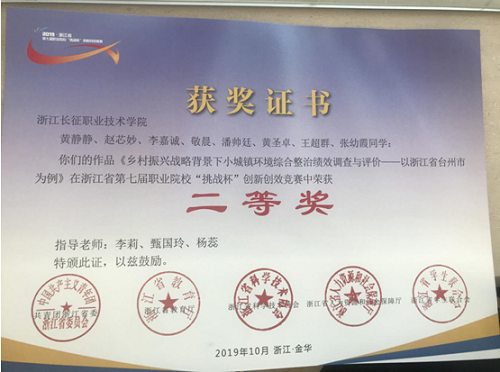 2019年10月18日至20日 ,由省团委、省教育厅、省科协、省人力与社会保障厅、浙江省学生联合会等单位主办的浙江省第七届职业院校“挑战杯”创新创效竞赛在金华职业技术学院举行。本次比赛共有来自全省44所高校的363件校赛优秀作品参加复赛选拔,最后共有150件作品入围决赛。在现场决赛答辩环节中,我校会计系、建筑工程系学生参赛作品《乡村振兴战略背景下小城镇环境综合整治绩效调查与评价——以浙江省台州为例》”脱颖而出,荣获二等奖。