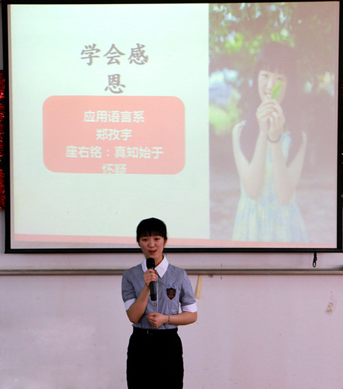 演讲以“感恩”为主题。16名选手各有所长,或妙语连珠,或热情洋溢。他们描述了自己的人生经历,分享了自己的成长故事。贸易系的选手陈晨以《感恩人生珍惜现在》为主题,通过救人大学生何俊斌的故事,告诉我们不管遇到什么苦难,都要珍惜现在,感激现在所拥有的一切,因为我们感恩依然活着。她的演讲生动精彩,内容充实,最终摘得桂冠,会计系蔡玛霖与戚梁良分获二、三等奖。