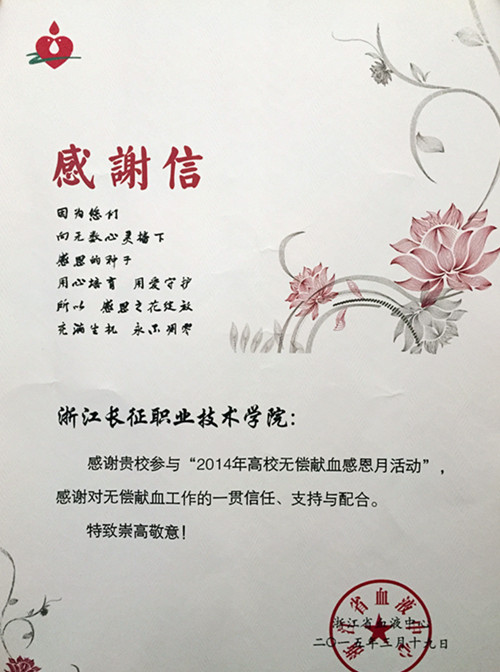 近日,浙江省血液中心向我院发来感谢信,在“2014年高校无偿献血感恩月活动“中, 301名志愿者共献血90940cc,对我院在活动中一贯的支持、信任与配合表示感谢。