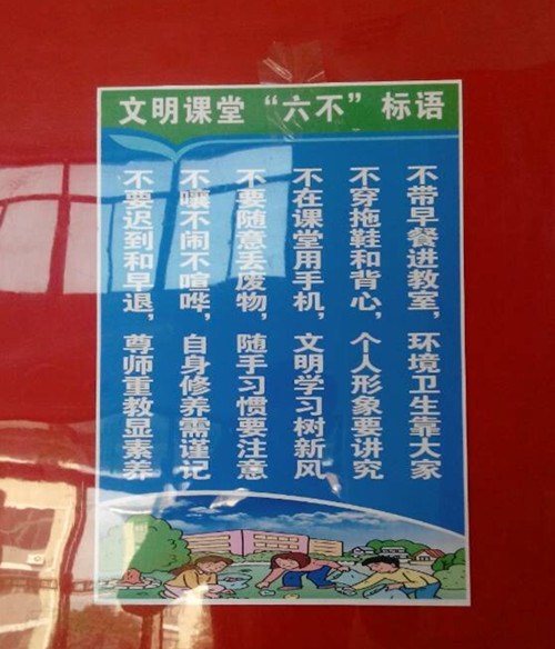 教室是学生学习、教师工作的重要场所,为了调整现状,营造良好的学习风气,在课堂上实行手机禁响以及课堂‘监控’等方式,不仅可以提高老师的教学水平,同时也可以提高同学们的听课效率。活动倡议大家从‘无手机课堂’做起,“抬起头看看周围的世界,低下头倾听书本的声音”;把早饭带进教室的行为,影响课堂的正常教学氛围和秩序。“早餐不进教室”活动开始后,得到众多同学的响应。大家纷纷表示,教室是公共场所,“六不”活动的提倡不仅可以提高同学们自身的素质,也是对老师和其他同学的尊重。