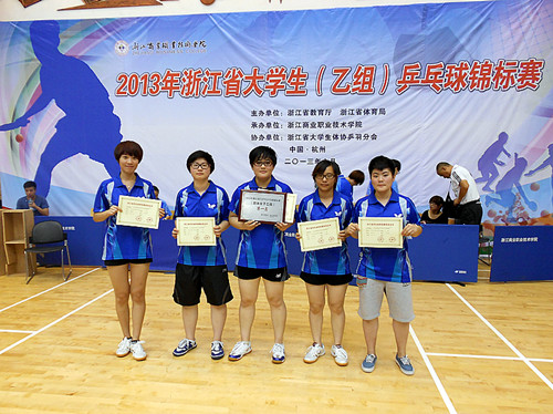 6 月5日由浙江省教育厅,浙江省体育局主办的2013年浙江省大学生乒乓球锦标赛在滨江浙江商业职业技术学院拉开序幕 ,来自全省27个学院代表队199名运动员参加了比赛。我院乒乓球代表队在领队兼教练周永奎带领下参加了比赛并获得了历史性的突破。在本次比赛中,我校乒乓球代表队勇于拼搏、文明比赛的精神赢得了组委会的一致好评。队员敢打敢拼,优良的赛风赢得了观众和对手的尊敬。其中,由钱一泓、吴天页、管郁婷、徐文燕、黄文捷组成的女队获得了乒乓球项目中分量最重的一枚金牌——女子团体冠军;;由陈佳宇、洪益军、杨桢、章超梁、张源组成的男队获男子团体第五名。在单项比赛中也取得了骄人的成绩:吴天页、管郁婷获女子双打第一名;钱一泓获女子单打第二名;陈佳宇、钱一泓获混合双打第二名;陈佳宇获男子单打第三名;吴天页获女子单打第五名;洪益军、管郁婷获混合双打第五名;吴天页还获得优秀运动员称号。(基础部供稿)
