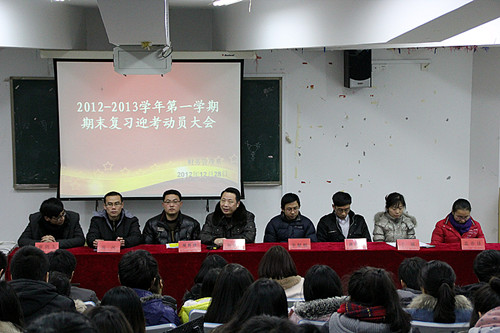 2012年12月28日下午13:00,在1218阶梯教室,财务管理系召开了关于假期的安全稳定教育和期末复习迎考动员大会。参加会议的有系主任何光平老师、系书记陆栋煜老师、全体思政管理干部及150名左右学生代表。会议由系辅导员张凤老师主持。