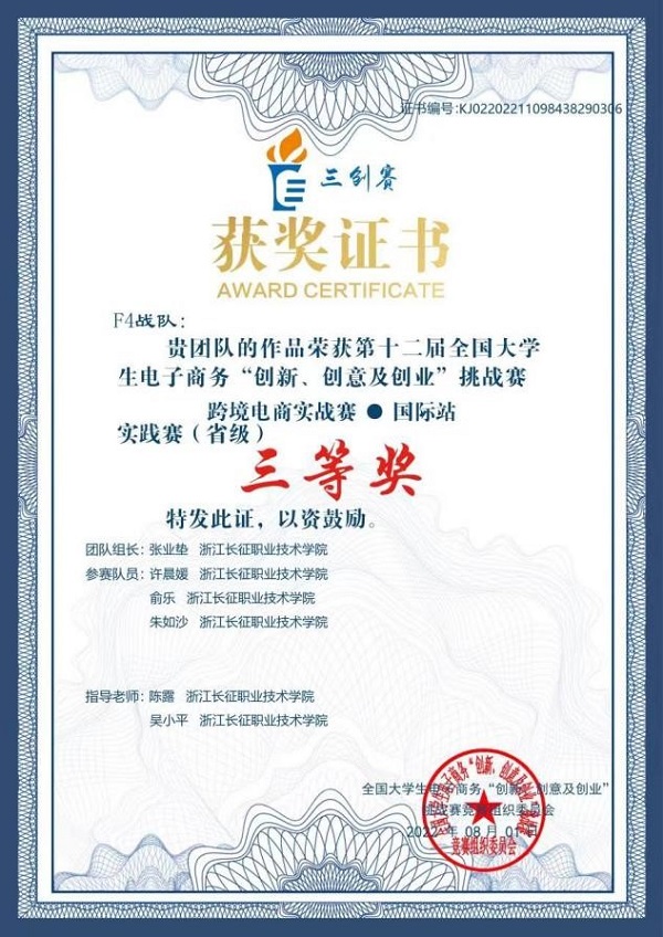 第十二届全国大学生电子商务“创新、创意及创业”挑战赛(简称“三创”赛)跨境电商实战赛实践赛(省赛)于2022年4月16日至6月30日举行,学校共有8支队伍晋级实践赛环节,经过2个半月的激烈角逐,由汪淑芳、杨翠香、吴小平、陈露、钟燕、李婷婷、包国华、苏敏等老师指导的5支队伍荣获国际站实践赛道省级三等奖。