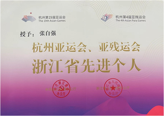 近日,浙江省委、省政府办公厅公布了“杭州亚运会、亚残运会浙江省先进个人”表彰名单,并召开了杭州亚运会、亚残运会总结表彰大会,我校基础部教师张自强凭借出色的工作表现和专业认真的工作态度,脱颖而出,被评为“杭州亚运会、亚残运会浙江省先进个人”。