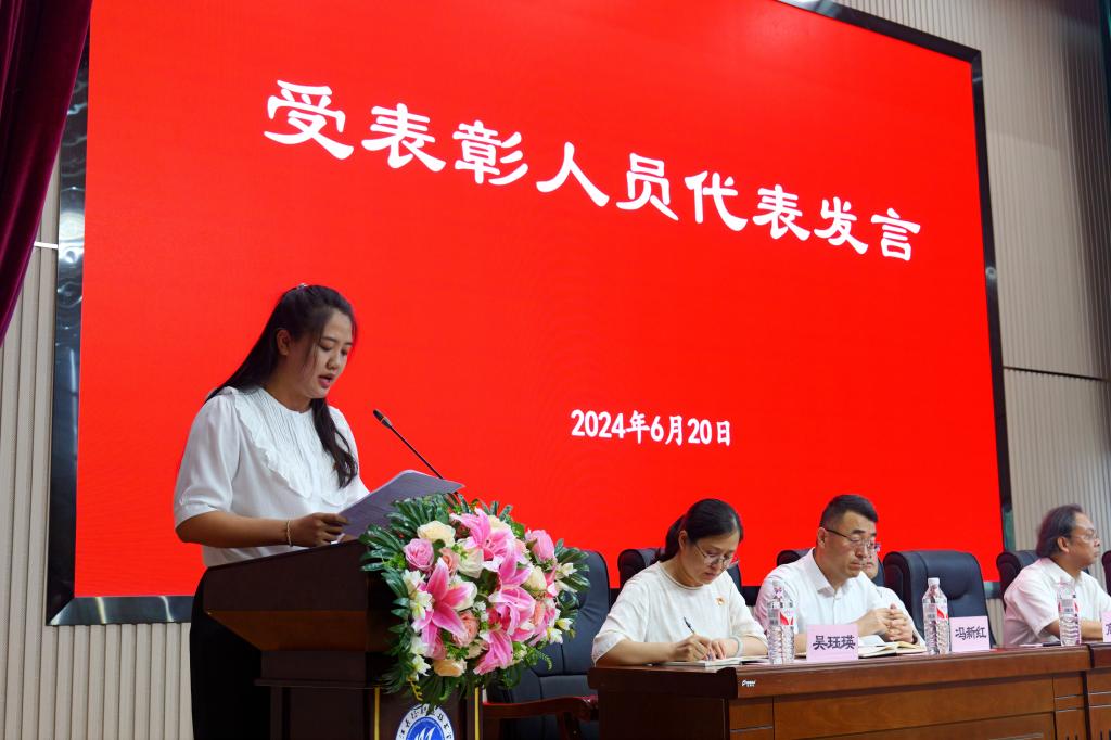 会议在庄严的国歌声中拉开帷幕。首先,由杜宝山宣读《关于表彰2023年度先进基层党组织、优秀共产党员、优秀党务工作者的决定》,授予人文与教育学院学生党支部等6个基层党组织“先进基层党组织”荣誉称号, 授予陈海飞等27位同志“优秀共产党员”荣誉称号,授予过芹芹等11位同志“优秀党务工作者”荣誉称号。 在热烈的掌声中,校领导向受表彰的先进基层党组织代表和获奖个人颁奖。颁奖结束后,管理学院学工办主任潘琦琛作为受表彰人员代表作了交流发言。