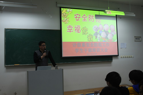计信系于2014年3月18日晚18:40在实训楼北403教室召开全系安全防范工作学生干部培训大会。参加会议的有各班班长、团支书、安全委员、心理委员及学生会勤保部全体和宿管会保卫部全体学生干部,会议由系党总支副书记陆栋煜老师主持并讲话。