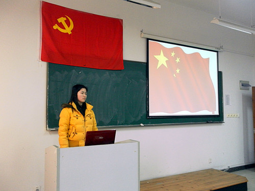 首先,奏国歌,全体党员起立行注目礼,在国歌声中拉开序幕,随后由系党总支书记杨军老师做关于在我系党员中开展佩戴党徽、重温入党誓词活动的动员。她说,开展活动的目的就是增强党员的党性观念,牢记党的宗旨,提升自身修养,增强角色意识,发挥带头作用。并对全体党员提出要求。接着全体参会师生党员面对党旗佩戴党徽。        教师党员代表高兴媛老师、学生党员代表王峰同学分别在会上发言。