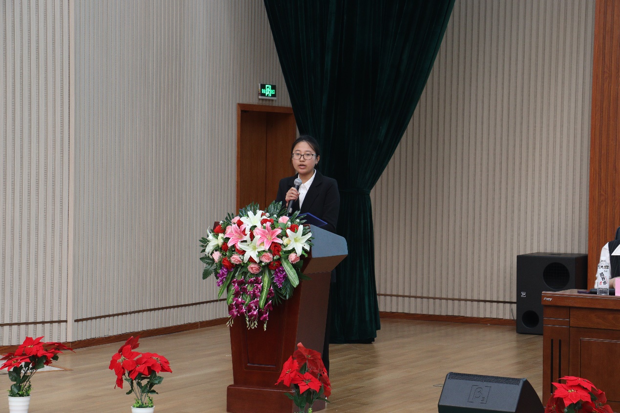 王伊晴作为学生代表发言,她代表全体实习生向母校的辛勤培育表示感谢,并承诺在工作中牢记老师们的叮嘱,不负老师们的期待,积极主动、不怕苦、不怕累,勤学好问,展示我校学生的良好素养,为学校争光添彩,以崭新的精神风貌、朝气蓬勃的工作热情、积极进取的学习态度投入到实习当中去,不辱使命,满载而归。