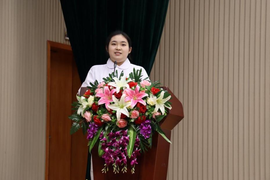 朱芝杉同学围绕夯实基础知识、端正思想态度和勇于把握机会等方面向同学们分享自己的心得体会。她表示,要在提高自身能力的同时摆正好态度,不断学习、不断努力,实现从一名护生到护士的角色转变,勇敢地争取机会、展现自己。