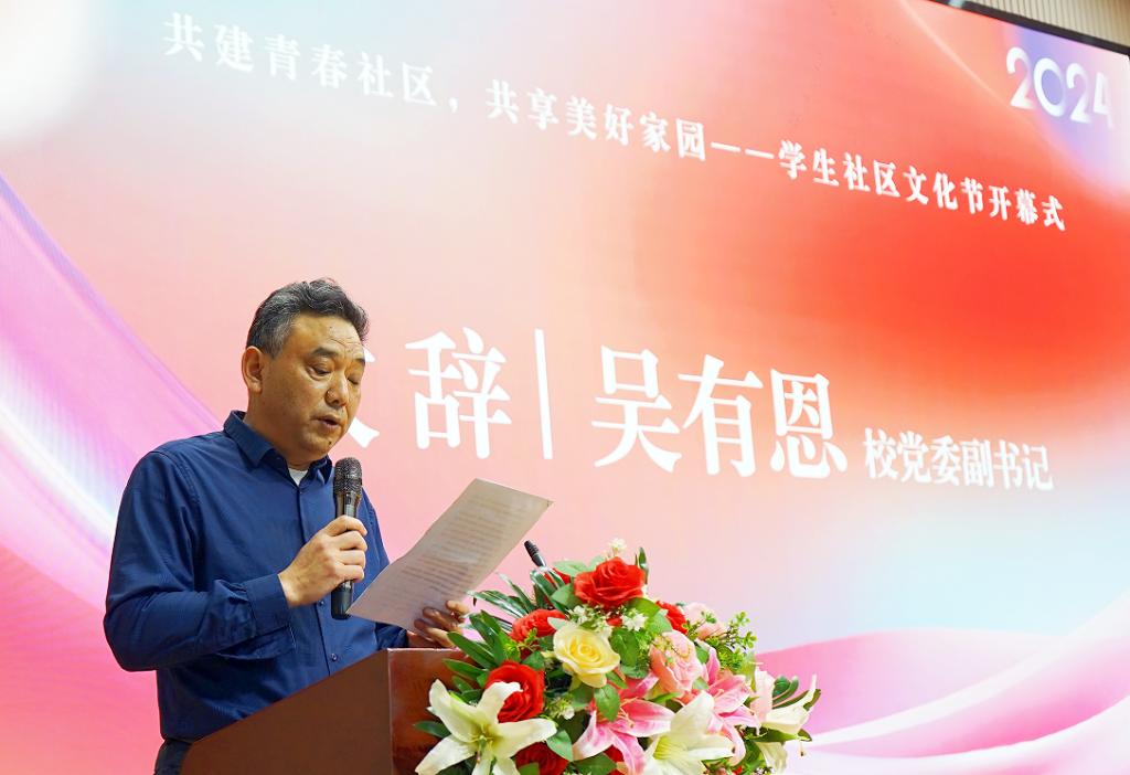活动伊始,吴有恩致开幕词。他指出,此次学生社区文化节以“共建青春社区,共享美好家园”为核心,旨在弘扬互助有为的价值观,激发创新活力,强化兴校荣校责任感,推动形成积极向上、健康文明的校园文化氛围。他强调,学生社区文化节是我们校园文化生活的一道亮丽风景线,是同学们自我教育、自我管理、自我服务的重要实践平台,是传承与创新校园文化的重要载体,是增进友谊、促进团结的纽带,更是我校落实立德树人根本任务,构建和谐校园、繁荣校园文化的重要举措。
