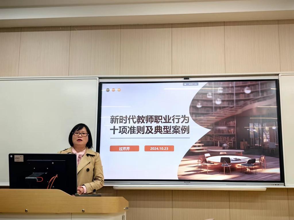 过芹芹为大家详细讲解了《新时代教师职业行为十项准则》,强调这些准则不仅是教师行为的规范,更是对教师职业道德的高度凝练,并通过一系列典型案例来提醒全体教师要时刻铭记自己的职责与使命,坚持立德树人,不忘教育初心,争做“四有”好老师。